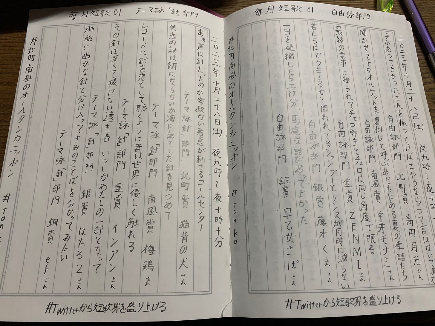 北町南風さんからの発表は、北町南風さん自身がパーソナリティをつとめるTwitterスペースの音声番組「オールタンカニッポン」の中でおこなわれました。北町南風さんよりTwitterスペース用の手書きの発表原稿をお預かりしましたのでこれを書き起こし、短歌マガジンより発表させていただきます。